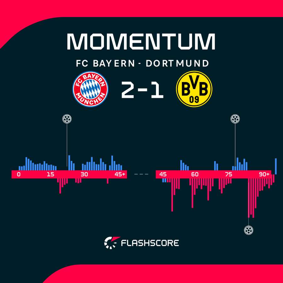 Następnie Diaz został zablokowany w polu karnym, a dobitkę Kimmicha obronił Kobel. W pierwszej połowie Bayern miał zdecydowaną przewagę, a wynik 0:1 był najniższym wymiarem kary dla czarno-żółtych.